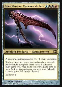 | Nome em Inglês: | Unscythe, Killer of Kings | | Nome em Português: | Foice Macabra, Matadora de Reis | | Custo de Mana: |     | | Tipo: | Artefato Lendário - Equipamento | | Texto: | A criatura Equipada ganha +3/+3 e tem Iniciativa. Toda vez que uma criatura que tenha sofrido dano causado pela criatura Equipada durante este turno Morrer, você pode Exilar aquele card. Se o fizer, coloque no Campo de Batalha uma ficha de criatura preta 2/2 do tipo Zumbi. Equipar . | | Série: |  | | Raridade: | Raro | | Card: | 114 |