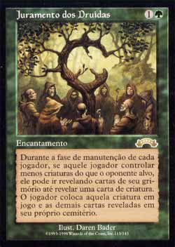 | Nome em Inglês: | Oath of Druids | | Nome em Português: | Juramento dos Druidas | | Custo de Mana: |   | | Tipo: | Encantamento | | Texto: | No início da Etapa de Manutenção de cada jogador, se aquele jogador controlar menos criaturas que qualquer um de seus próprios oponentes, aquele jogador pode revelar cards do topo de seu próprio grimório até revelar um card de criatura. Aquele jogador coloca aquele card no Campo de Batalha e os demais cards revelados desta forma em seu próprio cemitério. | | Série: |  | | Raridade: | Raro | | Card: | 115 |