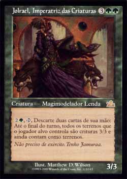 | Nome em Inglês: | Jolrael, Empress of Beasts | | Nome em Português: | Jolrael, Imperatriz das Criaturas | | Custo de Mana: |    | | Tipo: | Criatura Lendária - Humano Magimodelador | | Texto: |  , , descarte dois cards: Todos os terrenos que o jogador alvo controla tornam-se criaturas 3/3 que ainda são terrenos, até o final do turno. | | P/T: | 3/3 | | Série: |  | | Outras: | | | Raridade: | Raro | | Card: | 115 |