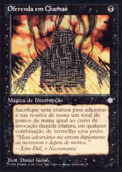 | Nome em Inglês: | Burnt Offering | | Nome em Português: | Oferenda em Chamas | | Custo de Mana: |  | | Tipo: | Mágica Instantânea | | Texto: | Como um custo adicional para Conjurar Burnt Offering, sacrifique uma criatura. Adiciona a sua reserva de mana uma quantidade de mana em qualquer combinação de preto e/ou vermelho igual ao Custo de Mana Convertido da criatura sacrificada. | | Série: |  | | Raridade: | Comum | | Card: | 116 |