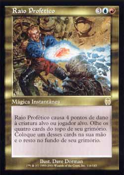| Nome em Inglês: | Prophetic Bolt | | Nome em Português: | Raio Profético | | Custo de Mana: |    | | Tipo: | Mágica Instantânea | | Texto: | Prophetic Bolt causa 4 pontos de dano à criatura ou ao jogador alvo. Olhe os quatro cards do topo de seu grimório. Coloque um daqueles cards em sua mão e o restante no fundo de seu grimório em qualquer ordem. | | Série: |  | | Outras: | | | Raridade: | Raro | | Card: | 116 |