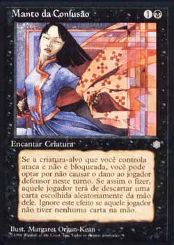 | Nome em Inglês: | Cloak of Confusion | | Nome em Português: | Manto da Confusão | | Custo de Mana: |   | | Tipo: | Encantamento - Aura | | Texto: | Encantar criatura que você controla. Toda vez que a criatura encantada atacar e não for bloqueada, você pode fazer com que ela não cause dano de combate durante este turno. Se o fizer, o jogador defensor descarta um card aleatoriamente. | | Série: |  | | Outras: | | | Raridade: | Comum | | Card: | 117 |