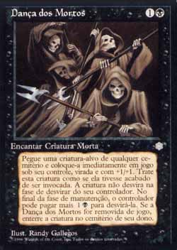 | Nome em Inglês: | Dance of the Dead | | Nome em Português: | Dança dos Mortos | | Custo de Mana: |   | | Tipo: | Encantamento | | Texto: | Encantar card de criatura de um cemitério. Quando Dance of the Dead entrar no Campo de Batalha, se Dance of the Dead permanecer no Campo de Batalha, Dance of the Dead perde 'Encantar card de criatura de um cemitério' e ganha 'Encantar criatura colocada no Campo de Batalha com Dance of the Dead'. Coloque um card de criatura alvo de um cemitério no Campo de Batalha, virada, sob seu controle e anexe Dance of the Dead àquela criatura. Quando Dance of the Dead deixar o Campo de Batalha, o controlador daquela criatura a sacrifica. A criatura encantada ganha +1/+1 e não desvira durante a Etapa de Desvirar de seu controlador. No início de sua própria Etapa de Manutenção, o controlador da criatura encantada pode pagar  . Se o fizer, desvire a criatura encantada. Quando Dance of the Dead deixar o Campo de Batalha, destrói a criatura encantada. Ela não pode ser Regenerada. | | Série: |  | | Raridade: | Incomum | | Card: | 118 |