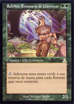 | Nome em Inglês: | Rofellos, Llanowar Emissary | | Nome em Português: | Rofellos, Emissário de Llanowar | | Custo de Mana: |   | | Tipo: | Criatura Lendária - Elfo Druida | | Texto: | : Adiciona a sua reserva de mana para cada Floresta que você controla. | | P/T: | 2/1 | | Série: |  | | Raridade: | Raro | | Card: | 118 |