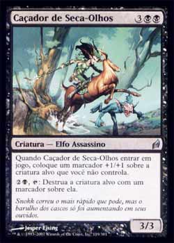 | Nome em Inglês: | Hunter of Eyeblights | | Nome em Português: | Caçador de Seca-Olhos | | Custo de Mana: |    | | Tipo: | Criatura - Elfo Assassino | | Texto: | Quando Hunter of Eyeblights entrar no Campo de Batalha, coloque um marcador +1/+1 na criatura alvo que você não controla.