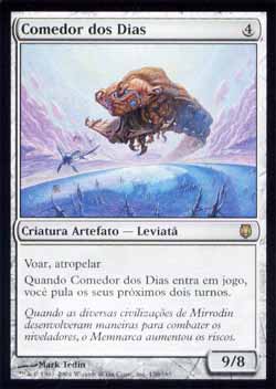 | Nome em Inglês: | Eater of Days | | Nome em Português: | Comedor dos Dias | | Custo de Mana: |  | | Tipo: | Criatura Artefato - Leviatã | | Texto: | Voar, Atropelar. Quando Eater of Days entrar no Campo de Batalha, você pula seus próximos dois turnos. | | P/T: | 9/8 | | Série: |  | | Raridade: | Raro | | Card: | 120 |