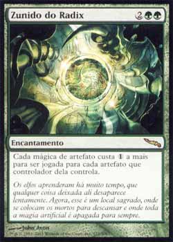 | Nome em Inglês: | Hum of the Radix | | Nome em Português: | Zunido do Radix | | Custo de Mana: |    | | Tipo: | Encantamento | | Texto: | Cada mágica de artefato custa a mais para ser Conjurada para cada artefato que seu controlador controla. | | Série: |  | | Raridade: | Raro | | Card: | 122 |
