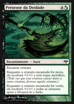 | Nome em Inglês: | Gift of the Deity | | Nome em Português: | Presente da Deidade | | Custo de Mana: |   | | Tipo: | Encantamento - Aura | | Texto: | Encantar criatura. Enquanto a criatura encantada for preta, ela ganha +1/+1 e tem Toque Mortífero. Enquanto a criatura encantada for verde, ela ganha +1/+1 e 'Todas as criaturas aptas a bloquear esta criatura o fazem'. | | Série: |  | | Raridade: | Comum | | Card: | 122 |
