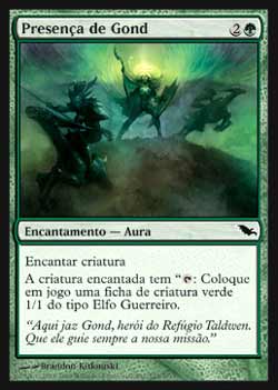 | Nome em Inglês: | Presence of Gond | | Nome em Português: | Presença de Gond | | Custo de Mana: |   | | Tipo: | Encantamento - Aura | | Texto: | Encantar criatura. A criatura encantada tem ' : Coloque no Campo de Batalha uma ficha de criatura verde 1/1 do tipo Elfo Guerreiro.' | | Série: |  | | Outras: | | | Raridade: | Comum | | Card: | 125 |