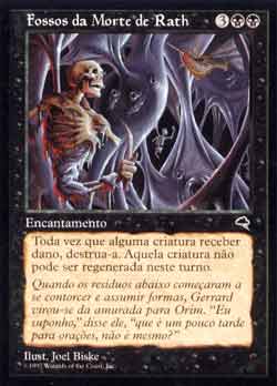 | Nome em Inglês: | Death Pits of Rath | | Nome em Português: | Fossos da Morte de Rath | | Custo de Mana: |    | | Tipo: | Encantamento | | Texto: | Toda vez que uma criatura sofrer dano, destrua-a. Aquela criatura não pode ser Regenerada. | | Série: |  | | Outras: | | | Raridade: | Raro | | Card: | 127 |