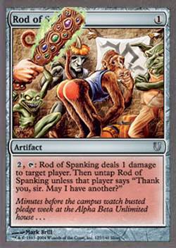 | Nome em Inglês: | Rod of Spanking | | Nome em Português: | Sem nome em Português | | Custo de Mana: |  | | Tipo: | Artefato | | Texto: | , : Rod of Spanking causa 1 ponto de dano ao jogador alvo. Então desvire Rod of Spanking a menos que aquele jogador diga “Obrigado, senhor. Posso levar mais uma?” | | Série: |  | | Raridade: | Incomum | | Card: | 127 |