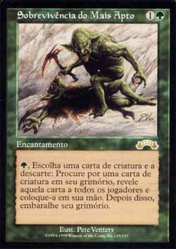 | Nome em Inglês: | Survival of the Fittest | | Nome em Português: | Sobrevivência do Mais Apto | | Custo de Mana: |   | | Tipo: | Encantamento | | Texto: | , descarte um card de criatura: Procure em seu grimório por um card de criatura, revele-o e coloque-o em sua mão. Embaralhe seu grimório a seguir. | | Série: |  | | Raridade: | Raro | | Card: | 129 |