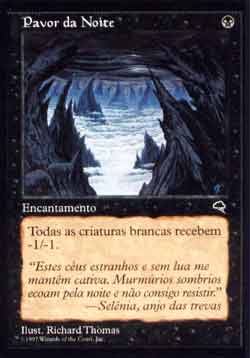 | Nome em Inglês: | Dread of Night | | Nome em Português: | Pavor da Noite | | Custo de Mana: |  | | Tipo: | Encantamento | | Texto: | As criaturas brancas ganham -1/-1. | | Série: |  | | Outras: | | | Raridade: | Incomum | | Card: | 130 |