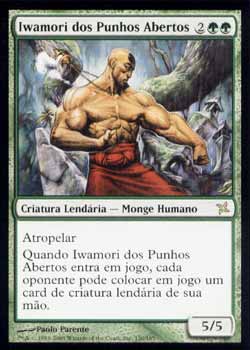 | Nome em Inglês: | Iwamori of the Open Fist | | Nome em Português: | lwamori dos Punhos Abertos | | Custo de Mana: |    | | Tipo: | Criatura Lendária - Humano Monge | | Texto: | Atropelar. Quando Iwamori of the Open Fist entrar no Campo de Batalha, cada oponente pode colocar um card de criatura Lendária de sua própria mão no Campo de Batalha. | | P/T: | 5/5 | | Série: |  | | Raridade: | Raro | | Card: | 130 |