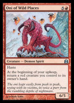 | Nome em Inglês: | Oni of Wild Places | | Nome em Português: | Sem nome em Português | | Custo de Mana: |   | | Tipo: | Criatura - Demônio Espírito | | Texto: | Ímpeto. No início de sua Etapa de Manutenção, devolva uma criatura vermelha que você controla para a mão de seu dono. | | P/T: | 6/5 | | Série: |  | | Outras: | | | Raridade: | Incomum | | Card: | 130 |