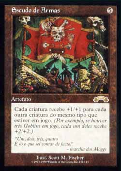 | Nome em Inglês: | Coat of Arms | | Nome em Português: | Escudo de Armas | | Custo de Mana: |  | | Tipo: | Artefato | | Texto: | Cada criatura ganha +1/+1 para cada outra criatura no Campo de Batalha que compartilhe um tipo de criatura com aquela criatura. | | Série: |  | | Outras: | | | Raridade: | Raro | | Card: | 131 |