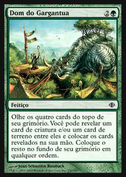 | Nome em Inglês: | Gift of the Gargantuan | | Nome em Português: | Dom do Gargantua | | Custo de Mana: |   | | Tipo: | Feitiço | | Texto: | Olhe os quatro cards do topo de seu grimório. Você pode revelar um card de criatura e/ou um card de terreno dentre eles e colocar os cards revelados desta forma em sua mão. Coloque o restante no fundo de seu grimório em qualquer ordem. | | Série: |  | | Raridade: | Comum | | Card: | 132 |