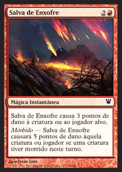 | Nome em Inglês: | Brimstone Volley | | Nome em Português: | Salva de Enxofre | | Custo de Mana: |   | | Tipo: | Mágica Instantânea | | Texto: | Brimstone Volley causa 3 pontos de dano à criatura ou ao jogador alvo. Mórbido - Brimstone Volley causa 5 pontos de dano àquela criatura ou jogador ao invés se uma criatura Morreu durante este turno. | | Série: |  | | Raridade: | Comum | | Card: | 132 |