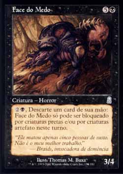 | Nome em Inglês: | Face of Fear | | Nome em Português: | Face do Medo | | Custo de Mana: |   | | Tipo: | Criatura - Horror | | Texto: |  , descarte um card: Face of Fear tem Amedrontar até o final do turno. | | P/T: | 3/4 | | Série: |  | | Raridade: | Incomum | | Card: | 134 |