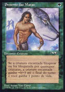 | Nome em Inglês: | Gift of the Woods | | Nome em Português: | Presente das Matas | | Custo de Mana: |  | | Tipo: | Encantamento - Aura | | Texto: | Encantar criatura. Toda vez que a criatura encantada bloquear ou for bloqueada, a criatura encantada ganha +0/+3 até o final do turno e você ganha 1 ponto de vida. | | Série: |  | | Outras: | | | Raridade: | Comum | | Card: | 135 |