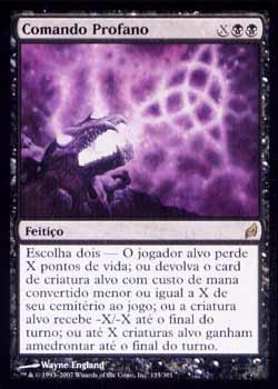 | Nome em Inglês: | Profane Command | | Nome em Português: | Comando Profano | | Custo de Mana: |    | | Tipo: | Feitiço | | Texto: | Escolha duas - o jogador alvo perde X pontos de vida; ou devolva o card de criatura alvo com Custo de Mana Convertido X ou menor de seu cemitério para o Campo de Batalha; ou a criatura alvo ganha -X/-X até o final do turno; ou até X criaturas alvo têm Amedrontar até o final do turno. | | Série: |  | | Outras: | | | Raridade: | Raro | | Card: | 135 |