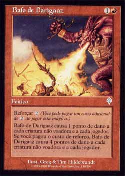 | Nome em Inglês: | Breath of Darigaaz | | Nome em Português: | Bafo de Darigaaz | | Custo de Mana: |   | | Tipo: | Feitiço | | Texto: | Reforçar . Breath of Darigaaz causa 1 ponto de dano a cada criatura sem Voar e a cada jogador. Se Breath of Darigaaz foi Reforçado, ele causa 4 pontos de dano a cada criatura sem Voar e a cada jogador ao invés. | | Série: |  | | Outras: | | | Raridade: | Incomum | | Card: | 138 |