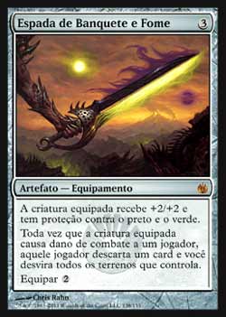 | Nome em Inglês: | Sword of Feast and Famine | | Nome em Português: | Espada de Banquete e Fome | | Custo de Mana: |  | | Tipo: | Artefato - Equipamento | | Texto: | A criatura Equipada ganha +2/+2 e tem Proteção contra o preto e Proteção contra o verde. Toda vez que a criatura Equipada causar dano de combate a um jogador, aquele jogador descarta um card e você desvira todos os terrenos que você controla. Equipar . | | Série: |  | | Raridade: | Mítico Raro | | Card: | 138 |