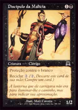| Nome em Inglês: | Disciple of Malice | | Nome em Português: | Discípulo da Malícia | | Custo de Mana: |   | | Tipo: | Criatura - Humano Clérigo | | Texto: | Proteção contra o branco. Reciclar . | | P/T: | 1/2 | | Série: |  | | Raridade: | Comum | | Card: | 139 |