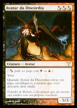 | Nome em Inglês: | Avatar of Discord | | Nome em Português: | Avatar da Discórdia | | Custo de Mana: |    | | Tipo: | Criatura - Avatar | | Texto: | Voar. Quando Avatar of Discord entrar no Campo de Batalha, sacrifique-o a menos que você descarte dois cards. | | P/T: | 5/3 | | Série: |  | | Outras: | | | Raridade: | Raro | | Card: | 140 |