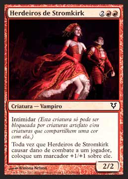 | Nome em Inglês: | Heirs of Stromkirk | | Nome em Português: | Herdeiros de Stromkirk | | Custo de Mana: |    | | Tipo: | Criatura - Vampiro | | Texto: | Intimidar. Toda vez que Heirs of Stromkirk causar dano de combate a um jogador, coloque um marcador +1/+1 nele. | | P/T: | 2/2 | | Série: |  | | Raridade: | Comum | | Card: | 140 |