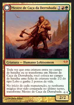 | Nome em Inglês: | Huntmaster of the Fells | | Nome em Português: | Mestre de Caça da Derrubada | | Custo de Mana: |    | | Tipo: | Criatura - Humano Lobisomem | | Texto: | Toda vez que esta criatura entrar no Campo de Batalha ou se Transformar em Huntmaster of the Fells, coloque no Campo de Batalha uma ficha de criatura verde 2/2 do tipo Lobo e você ganha 2 pontos de vida. No início de cada Etapa de Manutenção, se nenhuma mágica tiver sido Conjurada no último turno, Transforme Huntmaster of the Fells. | | P/T: | 2/2 | | Série: |  | | Raridade: | Mítico Raro | | Card: | 140a |