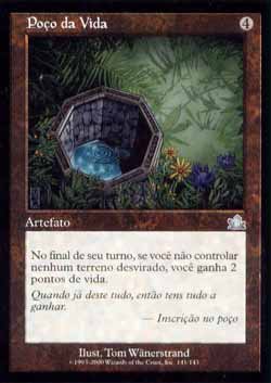 | Nome em Inglês: | Well of Life | | Nome em Português: | Poço da Vida | | Custo de Mana: |  | | Tipo: | Artefato | | Texto: | No início da próxima Etapa Final de seu próprio turno, se você não controla nenhum terreno desvirado, você ganha 2 pontos de vida. | | Série: |  | | Raridade: | Incomum | | Card: | 141 |