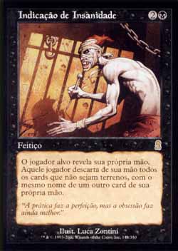 | Nome em Inglês: | Hint of Insanity | | Nome em Português: | Indicação de Insanidade | | Custo de Mana: |   | | Tipo: | Feitiço | | Texto: | O jogador alvo revela sua própria mão. Aquele jogador descarta todos os cards que não sejam de terreno e que tenham o mesmo nome de outro card em sua própria mão. | | Série: |  | | Raridade: | Raro | | Card: | 143 |