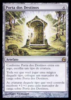 | Nome em Inglês: | Door of Destinies | | Nome em Português: | Porta dos Destinos | | Custo de Mana: |  | | Tipo: | Artefato | | Texto: | Conforme Door of Destinies entra no Campo de Batalha, escolha um tipo de criatura. Toda vez que você Conjurar uma mágica do tipo escolhido, coloque um marcador de carga em Door of Destinies. Criaturas que você controla do tipo escolhido ganham +1/+1 para cada marcador de carga em Door of Destinies. | | Série: |  | | Outras: | | | Raridade: | Raro | | Card: | 143 |