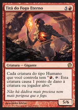 | Nome em Inglês: | Titan of Eternal Fire | | Nome em Português: | Titã do Fogo Eterno | | Custo de Mana: |   | | Tipo: | Criatura - Gigante | | Texto: | Cada criatura do tipo Humano que você controla tem ' , : Esta criatura causa 1 ponto de dano à criatura ou ao jogador alvo.' | | P/T: | 5/6 | | Série: |  | | Raridade: | Raro | | Card: | 144 |