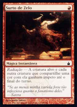 | Nome em Inglês: | Surge of Zeal | | Nome em Português: | Surto de Zelo | | Custo de Mana: |  | | Tipo: | Mágica Instantânea | | Texto: | Radiação - A criatura alvo e cada outra criatura que compartilhe uma cor com ela têm Ímpeto até o final do turno. | | Série: |  | | Raridade: | Comum | | Card: | 146 |