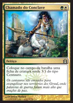 | Nome em Inglês: | Call of the Conclave | | Nome em Português: | Chamado do Conclave | | Custo de Mana: |   | | Tipo: | Feitiço | | Texto: | Coloque no Campo de Batalha uma ficha de criatura verde 3/3 do tipo Centauro. | | Série: |  | | Raridade: | Incomum | | Card: | 146 |