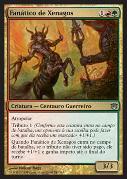 | Nome em Inglês: | Fanatic of Xenagos | | Nome em Português: | Fanático de Xenagos | | Custo de Mana: |    | | Tipo: | Criatura - Centauro Guerreiro | | Texto: | Atropelar. #Tributo 1. Quando Fanatic of Xenagos entrar no Campo de Batalha, se o #Tributo não tiver sido pago, ele ganha +1/+1 e tem Ímpeto até o final do turno. | | P/T: | 3/3 | | Série: |  | | Raridade: | Incomum | | Card: | 147 |