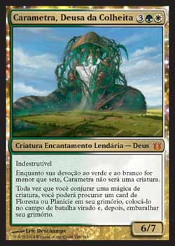 | Nome em Inglês: | Karametra, God of Harvests | | Nome em Português: | Carametra, Deusa da Colheita | | Custo de Mana: |    | | Tipo: | Criatura Encantamento Lendária - Deus | | Texto: | Indestrutível. Enquanto sua Devoção ao verde e branco for menor que sete, Karametra não é uma criatura. Toda vez que que você Conjurar uma mágica de criatura, você pode procurar em seu grimório por um card de Floresta ou Planície, colocá-lo no Campo de Batalha virado e então embaralhar seu grimório. | | P/T: | 6/7 | | Série: |  | | Raridade: | Mítico Raro | | Card: | 148 |