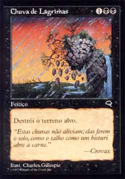 | Nome em Inglês: | Rain of Tears | | Nome em Português: | Chuva de Lágrimas | | Custo de Mana: |    | | Tipo: | Feitiço | | Texto: | Destrói o terreno alvo. | | Série: |  | | Outras: | | | Raridade: | Incomum | | Card: | 149 |