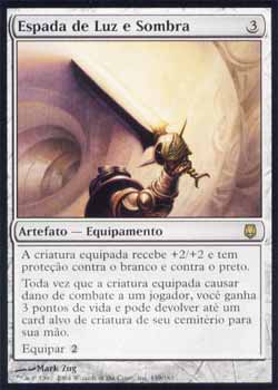 | Nome em Inglês: | Sword of Light and Shadow | | Nome em Português: | Espada de Luz e Sombra | | Custo de Mana: |  | | Tipo: | Artefato - Equipamento | | Texto: | A criatura Equipada ganha +2/+2 e tem Proteção contra o branco e Proteção contra o preto. Toda vez que a criatura Equipada causar dano de combate a um jogador, você ganha 3 pontos de vida e pode devolver até um um card de criatura alvo de seu cemitério para sua mão. Equipar . | | Série: |  | | Outras: | | | Raridade: | Raro | | Card: | 149 |