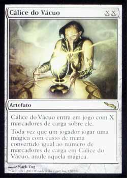 | Nome em Inglês: | Chalice of the Void | | Nome em Português: | Cálice do Vácuo | | Custo de Mana: |   | | Tipo: | Artefato | | Texto: | Chalice of the Void entra no Campo de Batalha com X marcadores de carga. Toda vez que um jogador Conjurar uma mágica com Custo de Mana Convertido igual ao número de marcadores de carga que houver em Chalice of the Void, anula aquela mágica. | | Série: |  | | Outras: | | | Raridade: | Raro | | Card: | 150 |