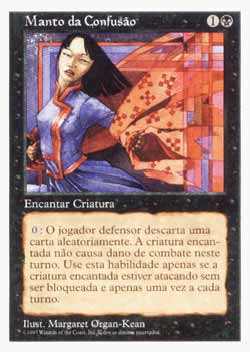| Nome em Inglês: | Cloak of Confusion | | Nome em Português: | Manto da Confusão | | Custo de Mana: |   | | Tipo: | Encantamento - Aura | | Texto: | Encantar criatura que você controla. Toda vez que a criatura encantada atacar e não for bloqueada, você pode fazer com que ela não cause dano de combate durante este turno. Se o fizer, o jogador defensor descarta um card aleatoriamente. | | Série: |  | | Outras: | | | Raridade: | Comum | | Card: | 151 |