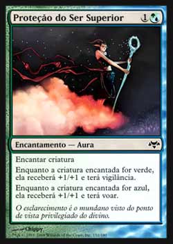 | Nome em Inglês: | Favor of the Overbeing | | Nome em Português: | Proteção do Ser Superior | | Custo de Mana: |   | | Tipo: | Encantamento - Aura | | Texto: | Encantar criatura. Enquanto a criatura encantada for verde, ela ganha +1/+1 e tem Vigilância. Enquanto a criatura encantada for azul, ela ganha +1/+1 e tem Voar. | | Série: |  | | Raridade: | Comum | | Card: | 151 |