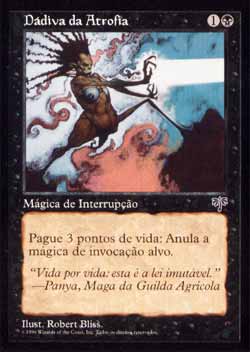 | Nome em Inglês: | Withering Boon | | Nome em Português: | Dádiva da Atrofia | | Custo de Mana: |   | | Tipo: | Mágica Instantânea | | Texto: | Como custo adicional para Conjurar Withering Boon, pague 3 pontos de vida. Anula a mágica de criatura alvo. | | Série: |  | | Raridade: | Incomum | | Card: | 152 |