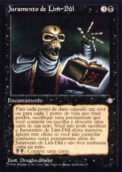 | Nome em Inglês: | Oath of Lim-Dûl | | Nome em Português: | Juramento de Lim-Dûl | | Custo de Mana: |   | | Tipo: | Encantamento | | Texto: | Toda vez que você perder vida, mesmo que seja por dano, sacrifique uma Permanente que não seja Oath of Lim-Dûl ou descarte um card para cada 1 ponto de vida que você tiver perdido.