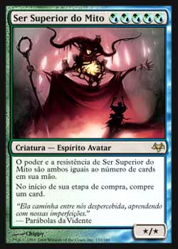 | Nome em Inglês: | Overbeing of Myth | | Nome em Português: | Ser Superior do Mito | | Custo de Mana: |      | | Tipo: | Criatura - Espírito Avatar | | Texto: | O poder e a resistência de Overbeing of Myth são ambos iguais ao número de cards em sua mão. No início de sua Etapa de Compra, compre um card. | | P/T: | */* | | Série: |  | | Raridade: | Raro | | Card: | 157 |