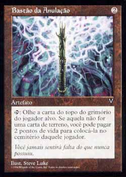 | Nome em Inglês: | Wand of Denial | | Nome em Português: | Bastão da Anulação | | Custo de Mana: |  | | Tipo: | Artefato | | Texto: | : Olhe o card do topo do grimório do jogador alvo. Se aquele card não for um card de terreno, você pode pagar 2 pontos de vida. Se o fizer, coloque-o no cemitério daquele jogador. | | Série: |  | | Outras: | | | Raridade: | Raro | | Card: | 159 |
