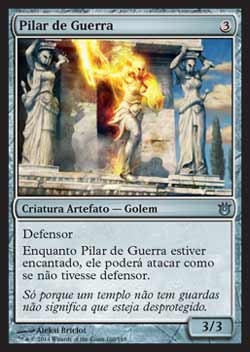| Nome em Inglês: | Pillar of War | | Nome em Português: | Pilar de Guerra | | Custo de Mana: |  | | Tipo: | Criatura Artefato - Golem | | Texto: | Defensor. Enquanto Pillar of War estiver encantado, ele pode atacar como se não tivesse Defensor. | | P/T: | 3/3 | | Série: |  | | Raridade: | Incomum | | Card: | 160 |
