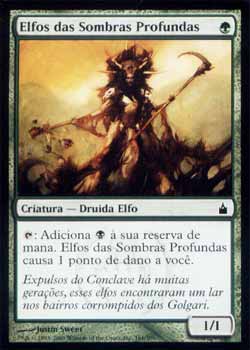 | Nome em Inglês: | Elves of Deep Shadow | | Nome em Português: | Elfos das Sombras Profundas | | Custo de Mana: |  | | Tipo: | Criatura - Elfo Druida | | Texto: | : Adiciona a sua reserva de mana. Elves of Deep Shadow causa 1 ponto de dano a você. | | P/T: | 1/1 | | Série: |  | | Outras: | | | Raridade: | Comum | | Card: | 161 |